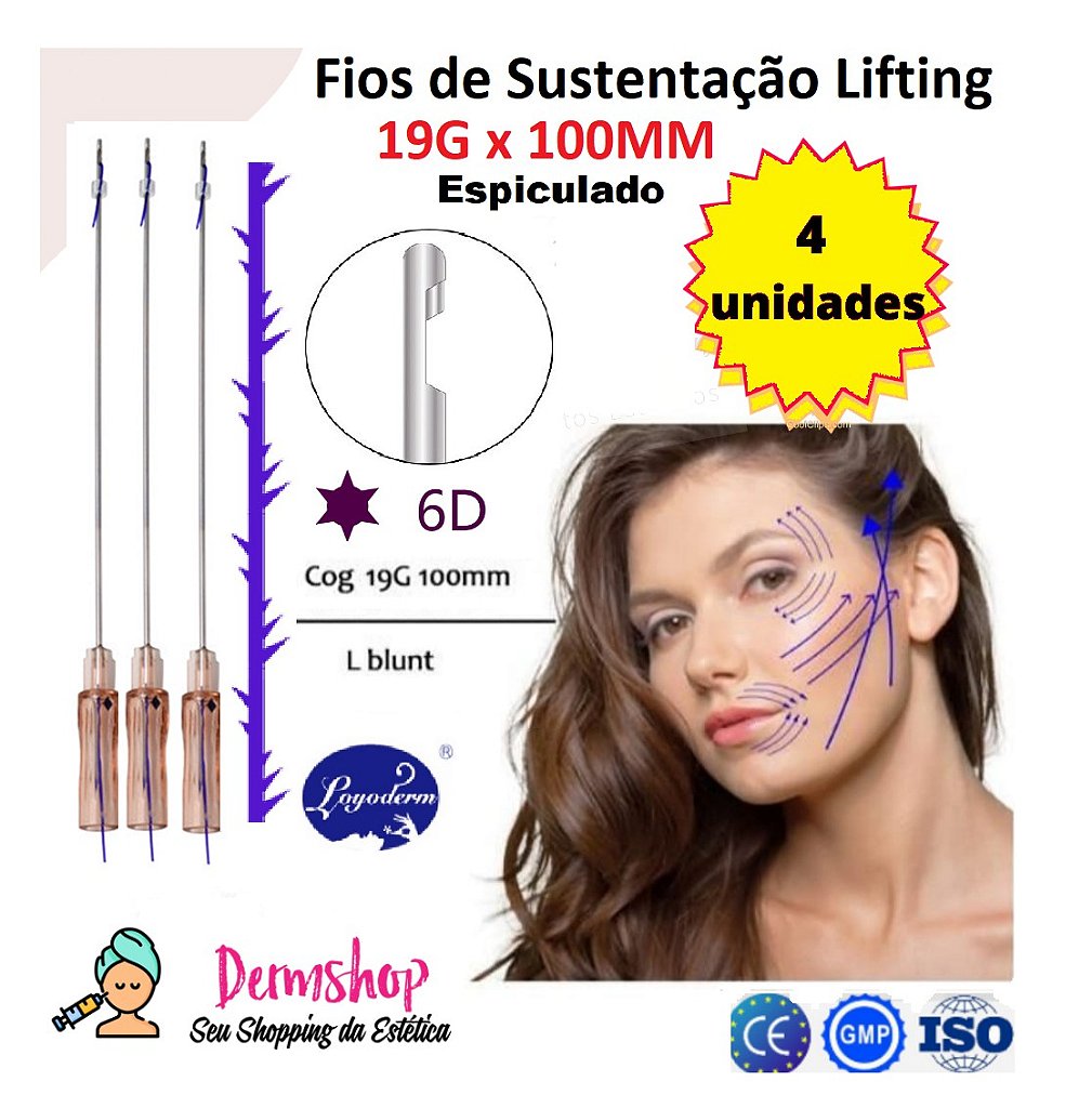 Fio de Sustentacao Cog 6D Espiculado Lifting 19gx100mm (4 Unidades) Loyoderm Ponta Cânula W -Fios de Sustentação PDO Tração Espiculado + Agulha para pertuito